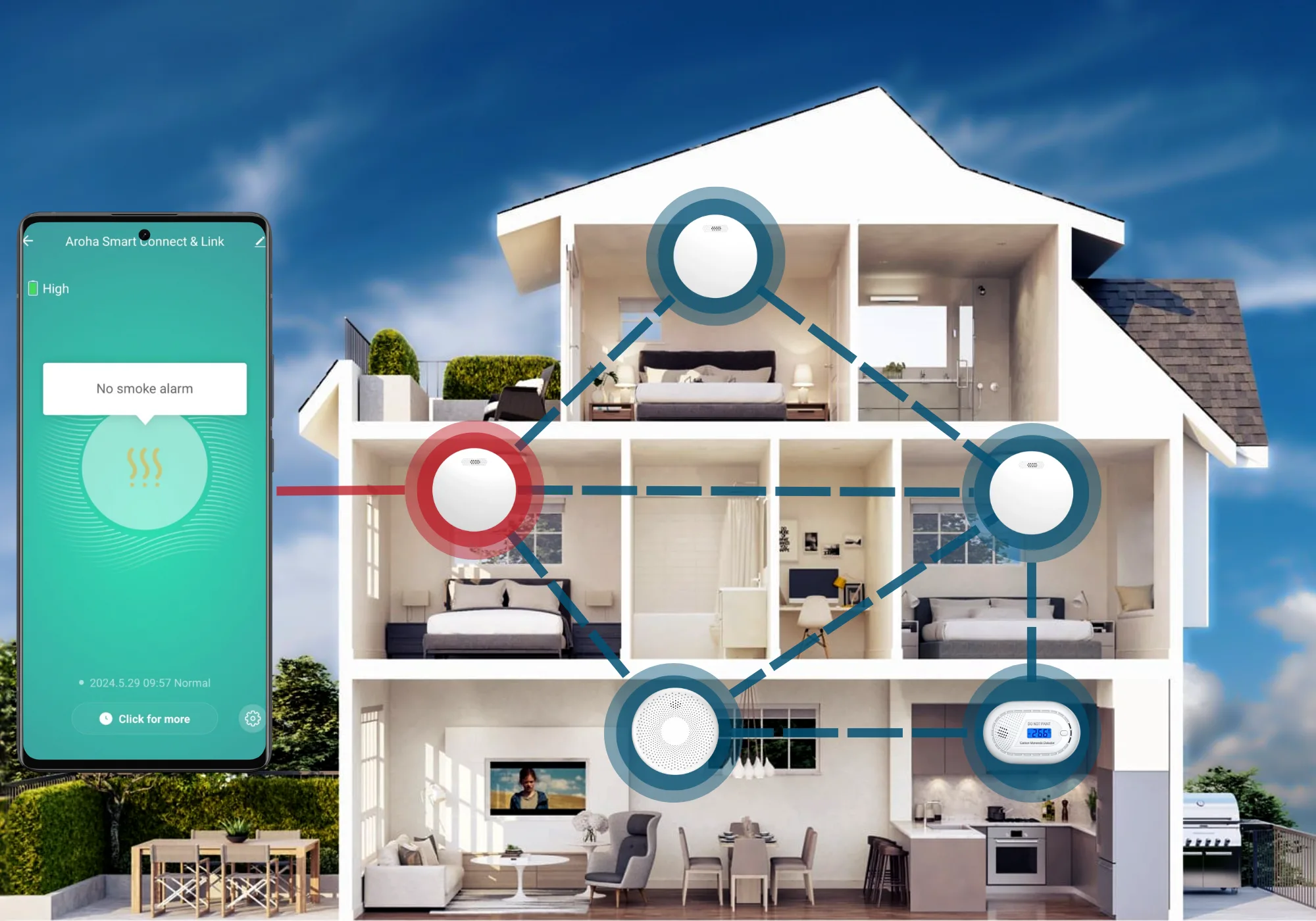 Sempre connesso al rilevatore di fumo Aroha Smart Connect & Link tramite l’app Tuya Smart o Smartlife. Grazie all’interconnessione con gli altri rilevatori Aroha Link, puoi sapere cosa sta succedendo nella tua casa e ricevere un avviso istantaneo sul tuo telefono in caso di pericolo.